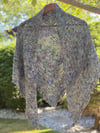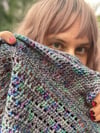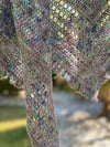 The City Lights Shawl is a triangular shaped shawl with a slight rise along the nape of the neck. Made using 2 skeins of fingering weight yarn, with beads and a fringe trim border, give it that extra sparkle that easily transitions from day to night.